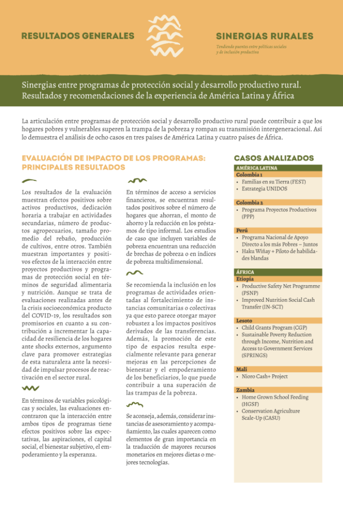 Este policy brief presenta un análisis sobre las sinergias entre programas de protección social y desarrollo productivo rural en América Latina y África, y cómo estos contribuyen a superar la pobreza y aumentar la resiliencia de los hogares.
