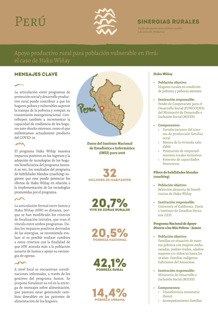 Este Policy Brief, presenta un resumen sobre el apoyo productivo rural para la población vulnerable en Perú, enfocándose en el programa Haku Wiñay.
