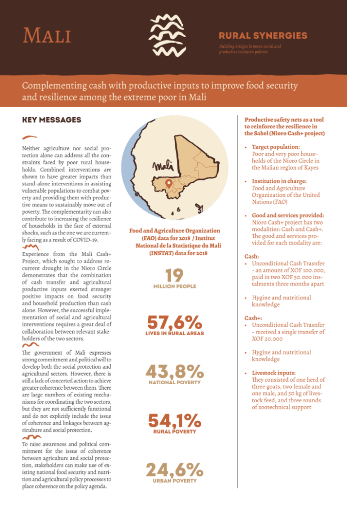 This policy brief discusses how linking social protection and rural development programs can help vulnerable households escape poverty and increase their resilience to shocks. It highlights findings from studies in Ethiopia, Lesotho, Mali, and Zambia.