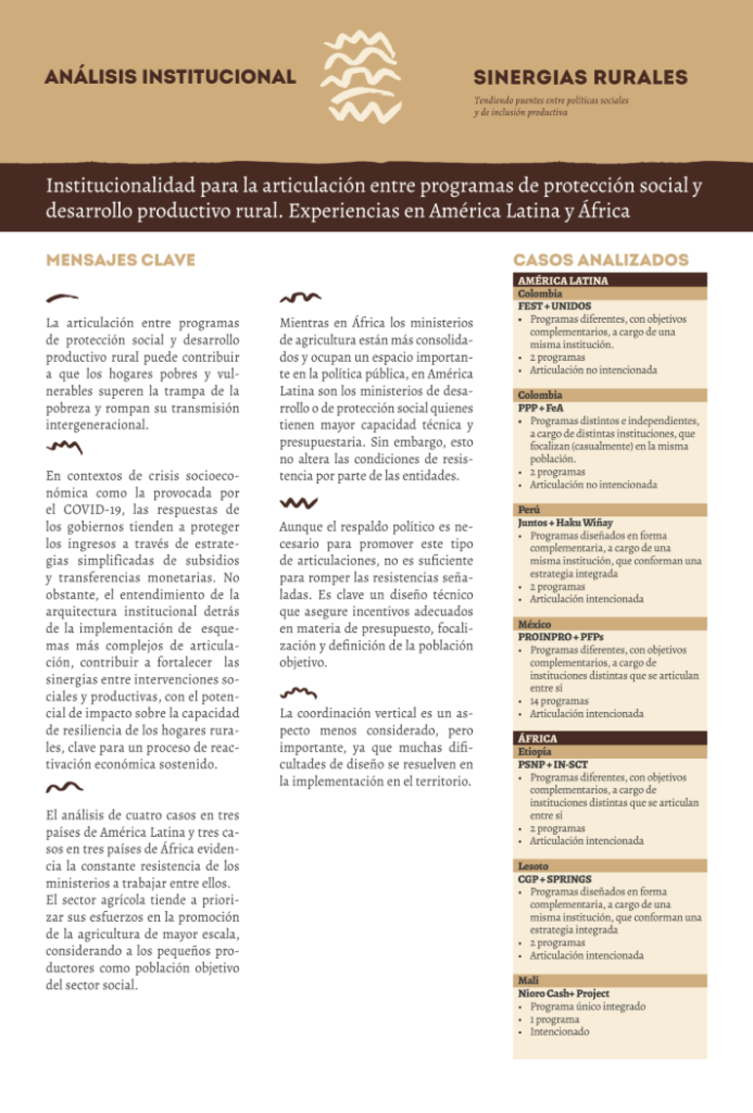 Este policy brief presenta un análisis institucional sobre la articulación entre programas de protección social y desarrollo productivo rural en América Latina y África, buscando contribuir a que los hogares pobres superen la trampa de la pobreza.