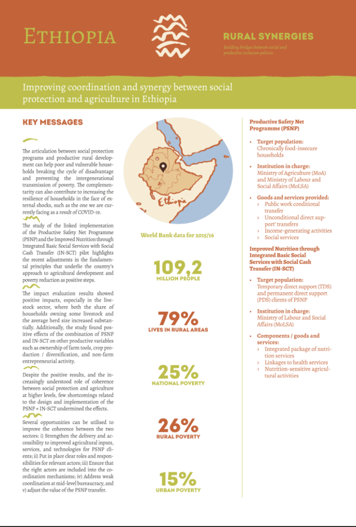 This policy brief, highlights how linking social protection and rural development programs can help vulnerable households escape poverty and increase their resilience to external shocks, like COVID-19. The study focuses on Ethiopia’s Productive Safety Net Programme (PSNP) and the Improved Nutrition through Integrated Basic Social Services with Social Cash Transfer (IN-SCT) pilot.