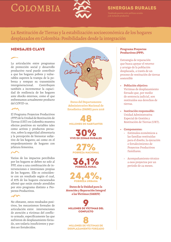 Este Policy Brief, se centra en el Programa Proyectos Productivos (PPP) de la Unidad de Restitución de Tierras (URT) en Colombia. Este programa busca apoyar el retorno y arraigo de la población desplazada a través de la restitución de tierras, ofreciendo estímulos económicos y acompañamiento técnico a proyectos productivos familiares por un período de 24 meses.