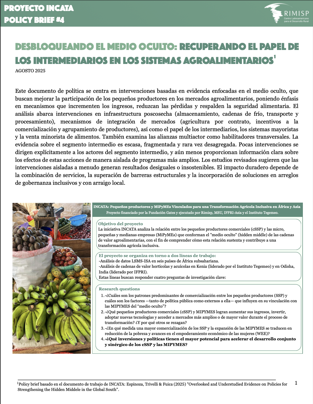 Este documento de política se centra en intervenciones basadas en evidencia enfocadas en el medio oculto, que buscan mejorar la participación de los pequeños productores en los mercados agroalimentarios, poniendo énfasis en mecanismos que incrementen los ingresos, reduzcan las pérdidas y respalden la seguridad alimentaria. El análisis abarca intervenciones en infraestructura poscosecha (almacenamiento, cadenas de frío, transporte y procesamiento), mecanismos de integración de mercados (agricultura por contrato, incentivos a la comercialización y agrupamiento de productores), así como el papel de los intermediarios, los sistemas mayoristas y la venta minorista de alimentos. También examina las alianzas multiactor como habilitadores transversales. La evidencia sobre el segmento intermedio es escasa, fragmentada y rara vez desagregada. Pocas intervenciones se dirigen explícitamente a los actores del segmento intermedio, y aún menos proporcionan información clara sobre los efectos de estas acciones de manera aislada de programas más amplios. Los estudios revisados sugieren que las intervenciones aisladas a menudo generan resultados desiguales o insostenibles. El impacto duradero depende de la combinación de servicios, la superación de barreras estructurales y la incorporación de soluciones en arreglos de gobernanza inclusivos y con arraigo local.